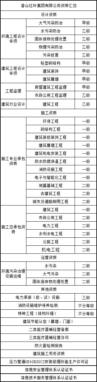 香山红叶集团有限公司资质汇总