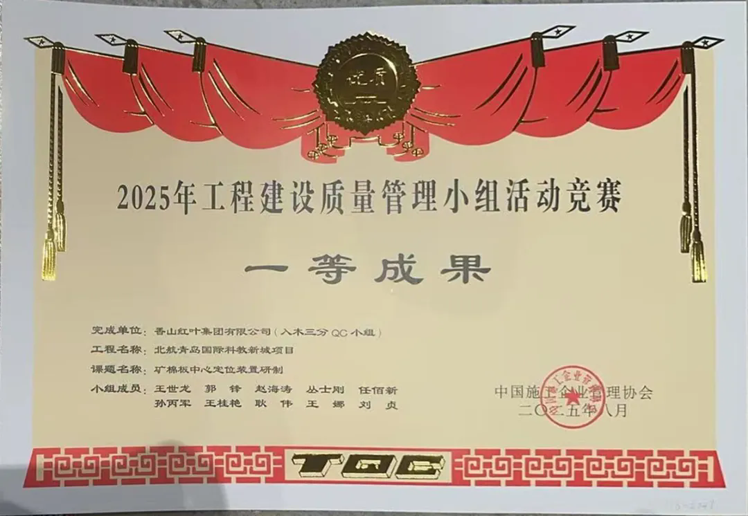 近日,在中国建筑业协会 、中国施工企业管理协会2025 年工程建设质量管理小组活动竞赛中,香山红叶集团 “入木三分”QC 小组捷报频传—— “装饰工程多功能安全挂接装置研制” 与 “矿棉板中心定位装置研制” 双双斩获一等奖。荣誉的获得不仅彰显了集团在工程质量改进领域的硬核创新实力,更印证了在行业质量管理升级进程中的标杆地位。