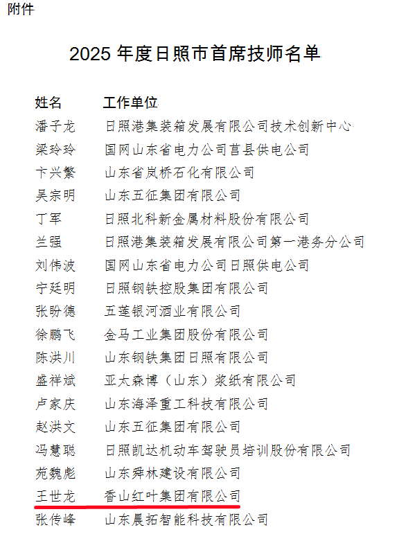 近日,中共日照市委组织部、日照市人力资源和社会保障局、日照市财政局联合公布2025年度日照市首席技师名单,香山红叶集团王世龙同志成功入选!这一荣誉是依据《日照市首席技师选拔管理办法(暂行)》,经逐级推荐、选拔、考察公示等严格程序确定,既是对王世龙同志扎实专业技能、突出工作业绩的高度认可,也彰显了集团在技能人才培养方面的显著成效。