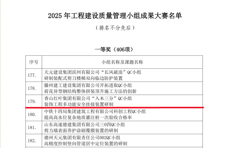 近日,在中国建筑业协会 、中国施工企业管理协会2025 年工程建设质量管理小组活动竞赛中,香山红叶集团 “入木三分”QC 小组捷报频传—— “装饰工程多功能安全挂接装置研制” 与 “矿棉板中心定位装置研制” 双双斩获一等奖。荣誉的获得不仅彰显了集团在工程质量改进领域的硬核创新实力,更印证了在行业质量管理升级进程中的标杆地位。